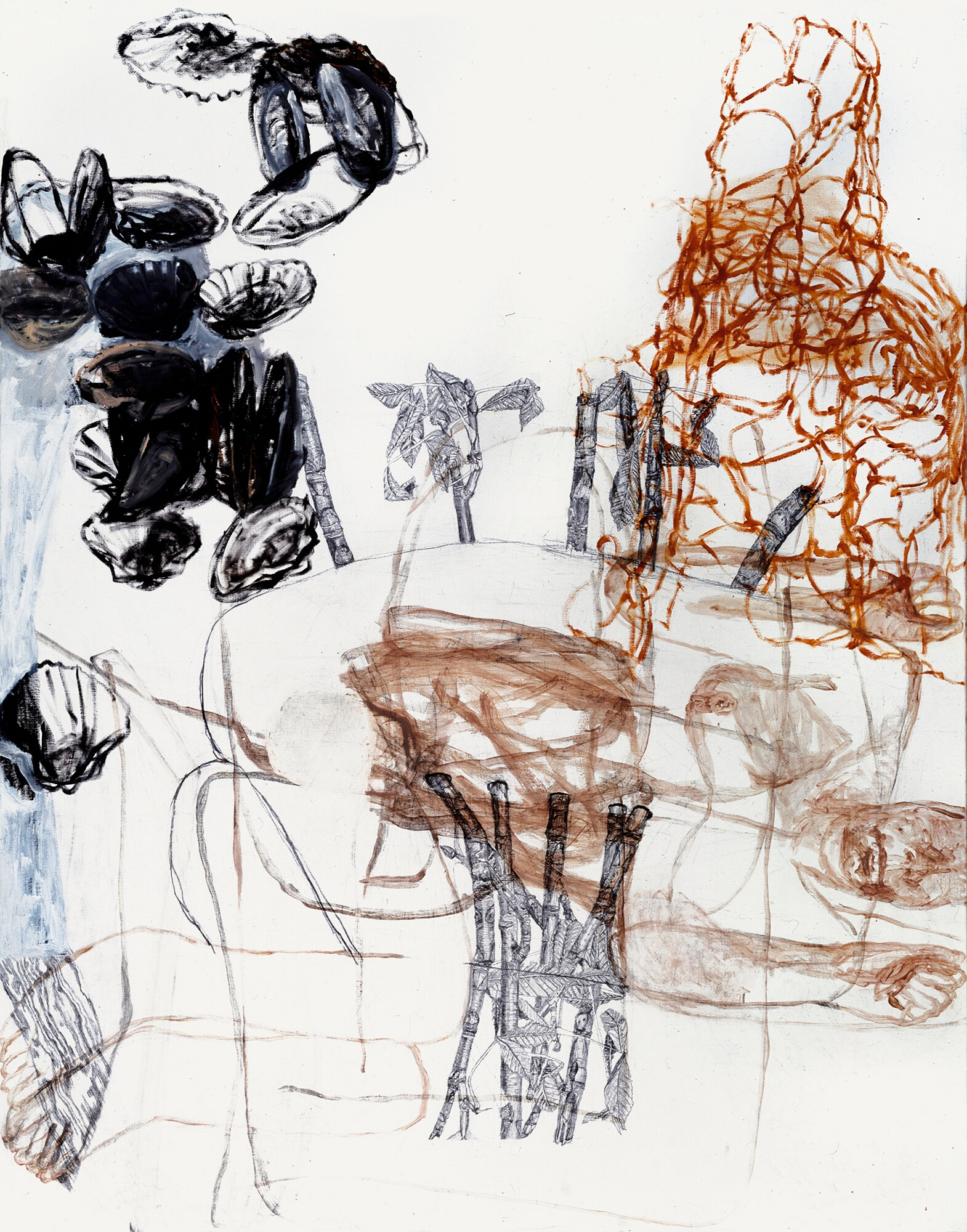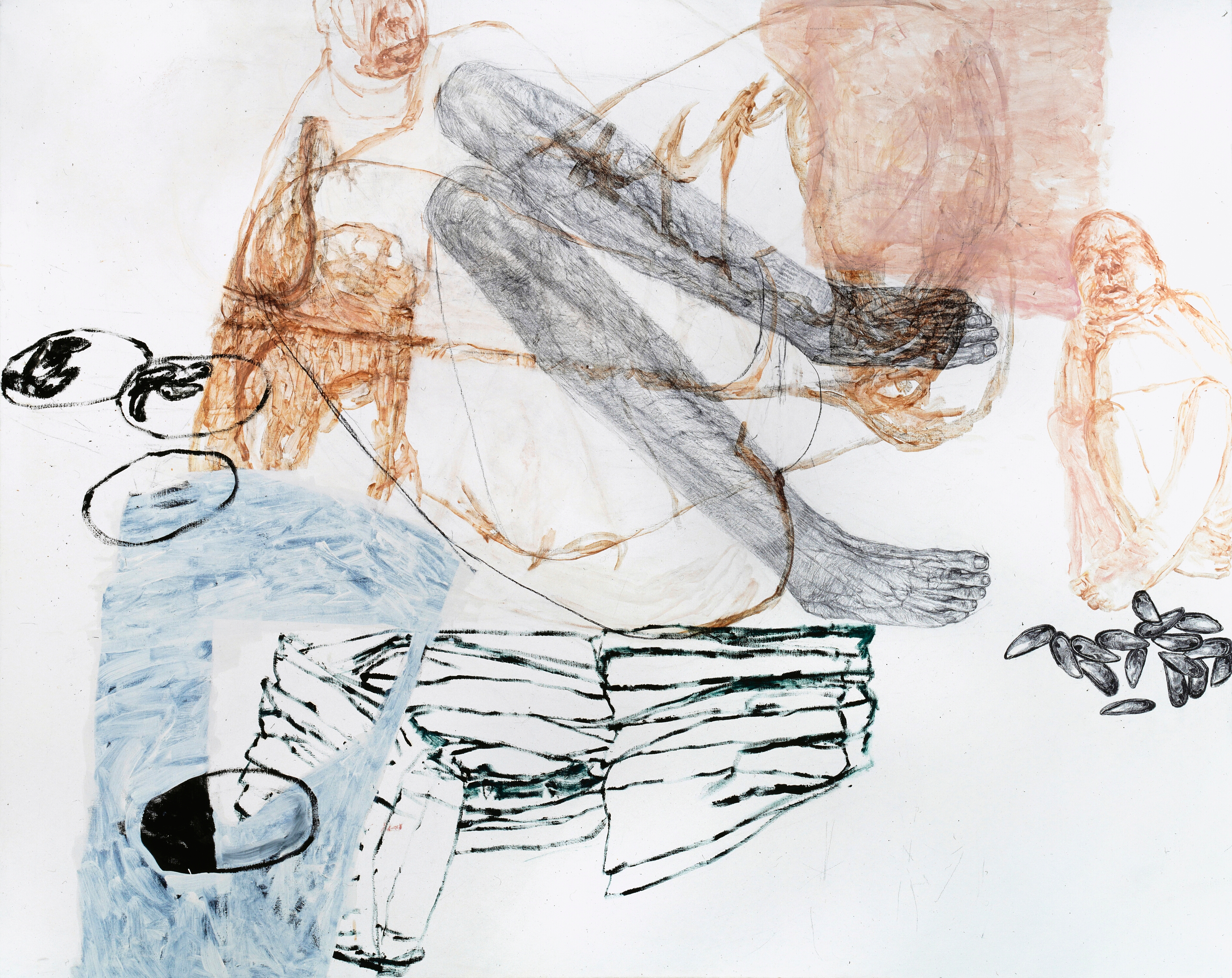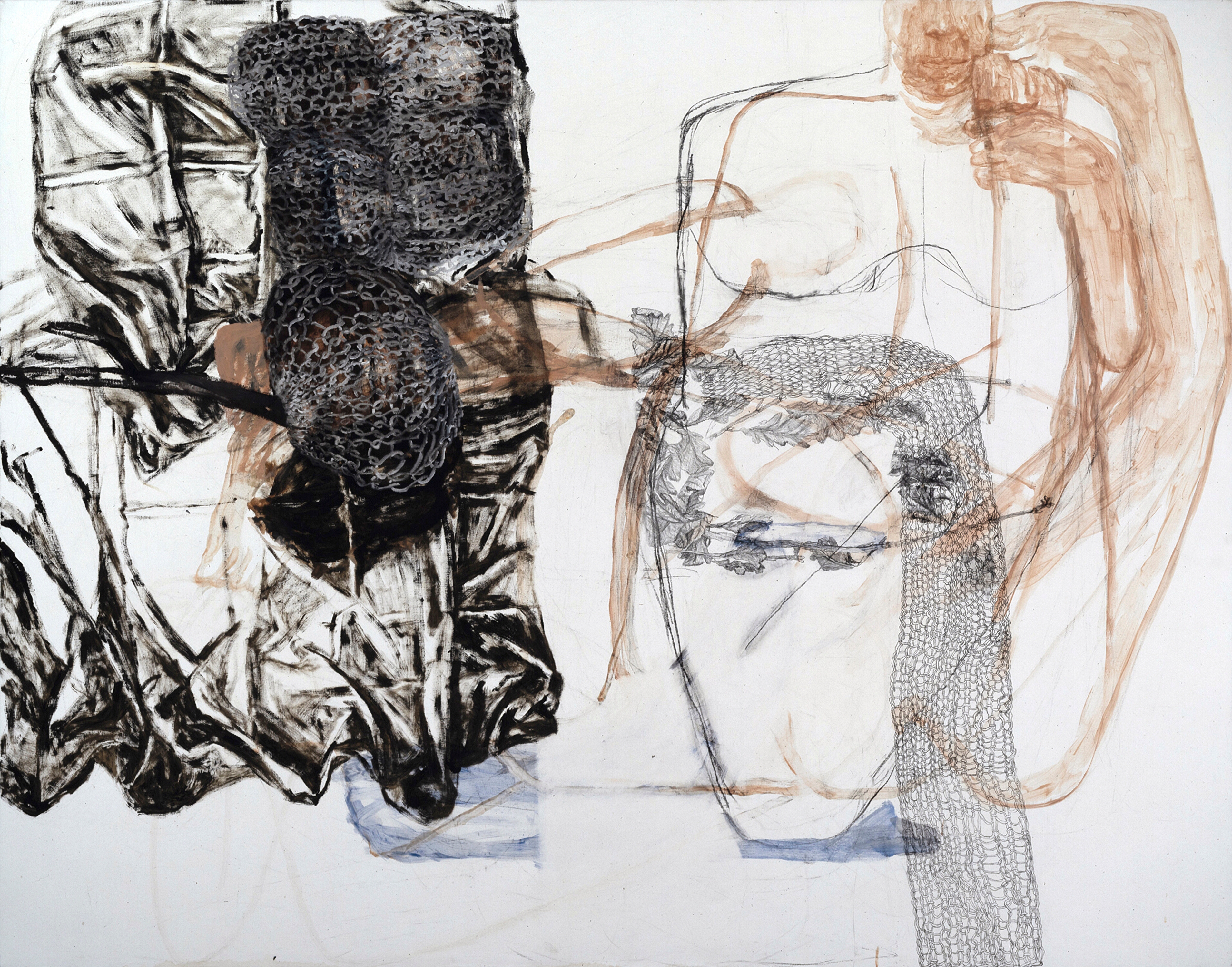 Musterbild, Eitempera und Kohle auf Papier, 126 x 106 cm, 1995  Treibholz, Eitempera, Öl und Kohle auf Papier, 122 x 106 cm, 1995  Geburtsversuch, Eitempera, Öl und Kohle auf Papier, 124 x 106 cm, 1995  Löffelbild, Eitempera und Kohle auf Papier, 124 x 106 cm, 1995  Faltenrockträgerin, Eitempera und Kohle auf Papier, 122 x 104 cm, 1995  Förmchenspiel, Eitempera und Kohle auf Papier, 125 x 106 cm, 1995  Frau an Birken, Eitempera, Öl und Kohle auf Leinwand, 220 x 165 cm, 1995  Daphne mit Netz, Eitempera, Öl und Kohle auf Leinwand, 210 x 165 cm, 1995  Große Faltanleitung, Eitempera, Kohle, Öl auf Leinwand, 210 x 165 cm, 1995  Große Pfützenbildung, Eitempera, Öl und Kohle auf Leinwand, 165 x 210 cm, 1995  Hockende mit Muschel, Eitempera, Öl und Kohle auf Leinwand, 165 x 210 cm, 1995/1996  Liegende mit Schnittkette, Eitempera, Öl und Kohle auf Leinwand, 210x 165 cm, 1995 19961994