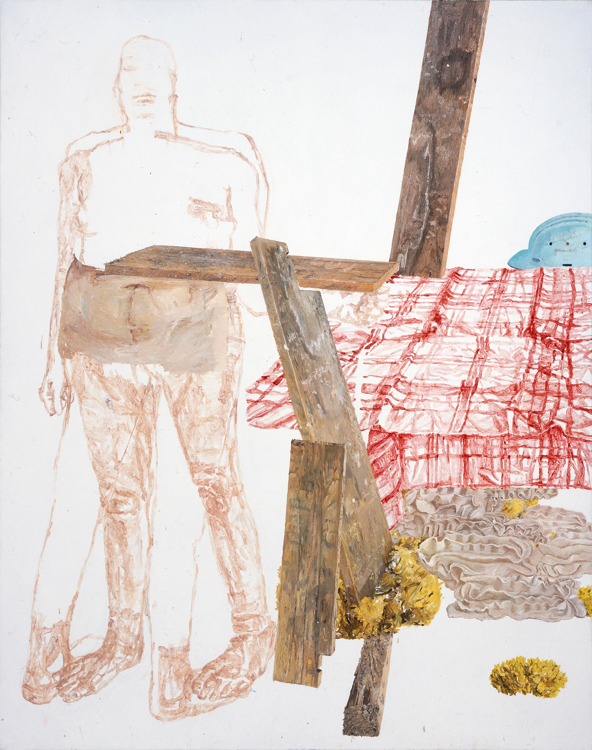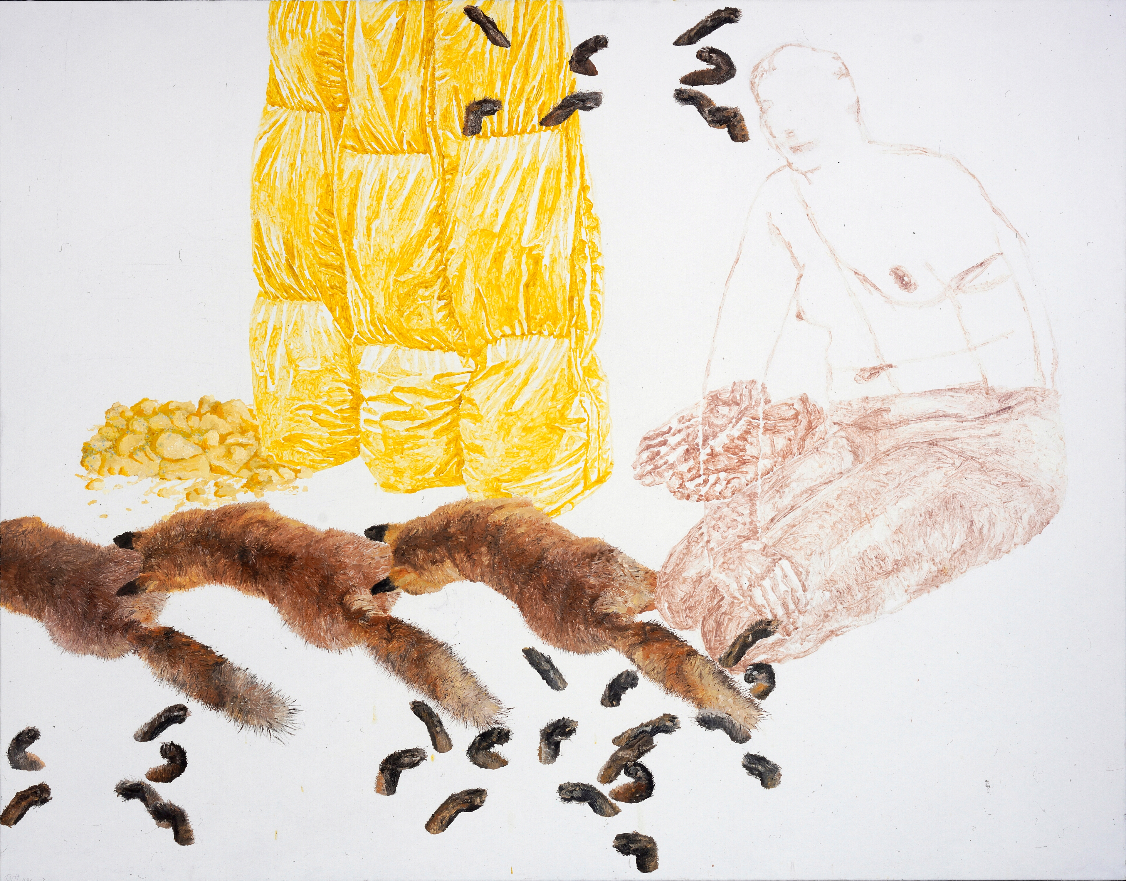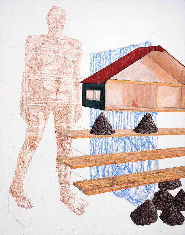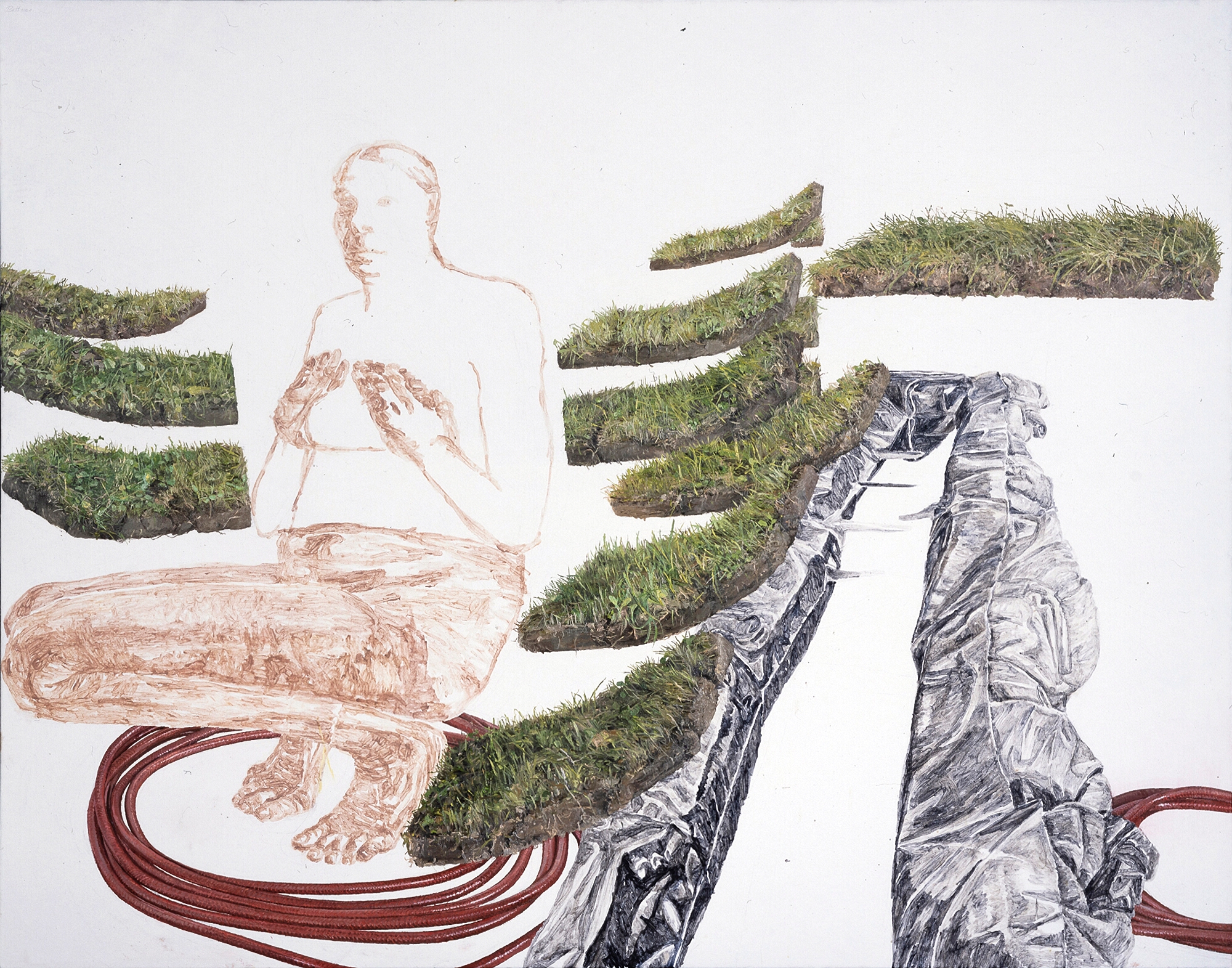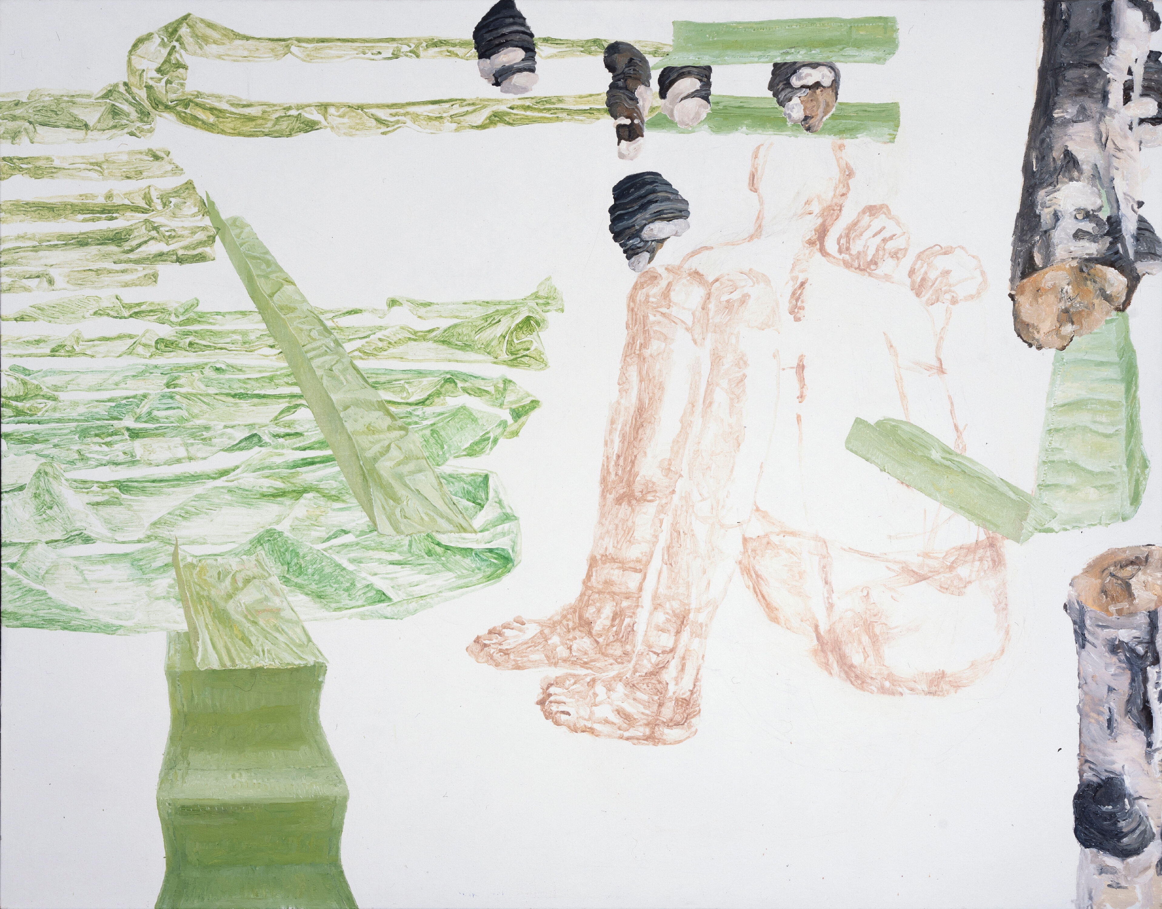 Ordnungswille, Eitemperata, Öl auf Leinwand, 210 x 165 cm, 2001/2002  Baustelle, Eitemperata, Öl auf Leinwand, 210 x 165 cm, 2001  Musterung, Eitemperata, Öl auf Leinwand, 165 x 210 cm, 2001  Grasrutschen, Eitemperata, Öl auf Leinwand, 165 x 210 cm, 2001  Befall, Eitemperata, Öl auf Leinwand, 165 x 210 cm, 2001 20022000