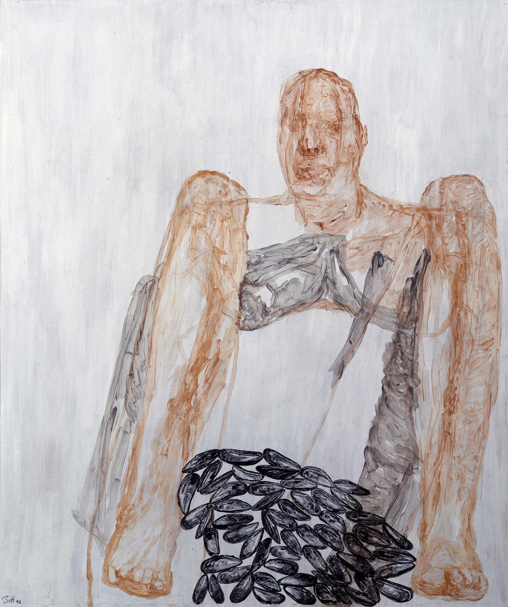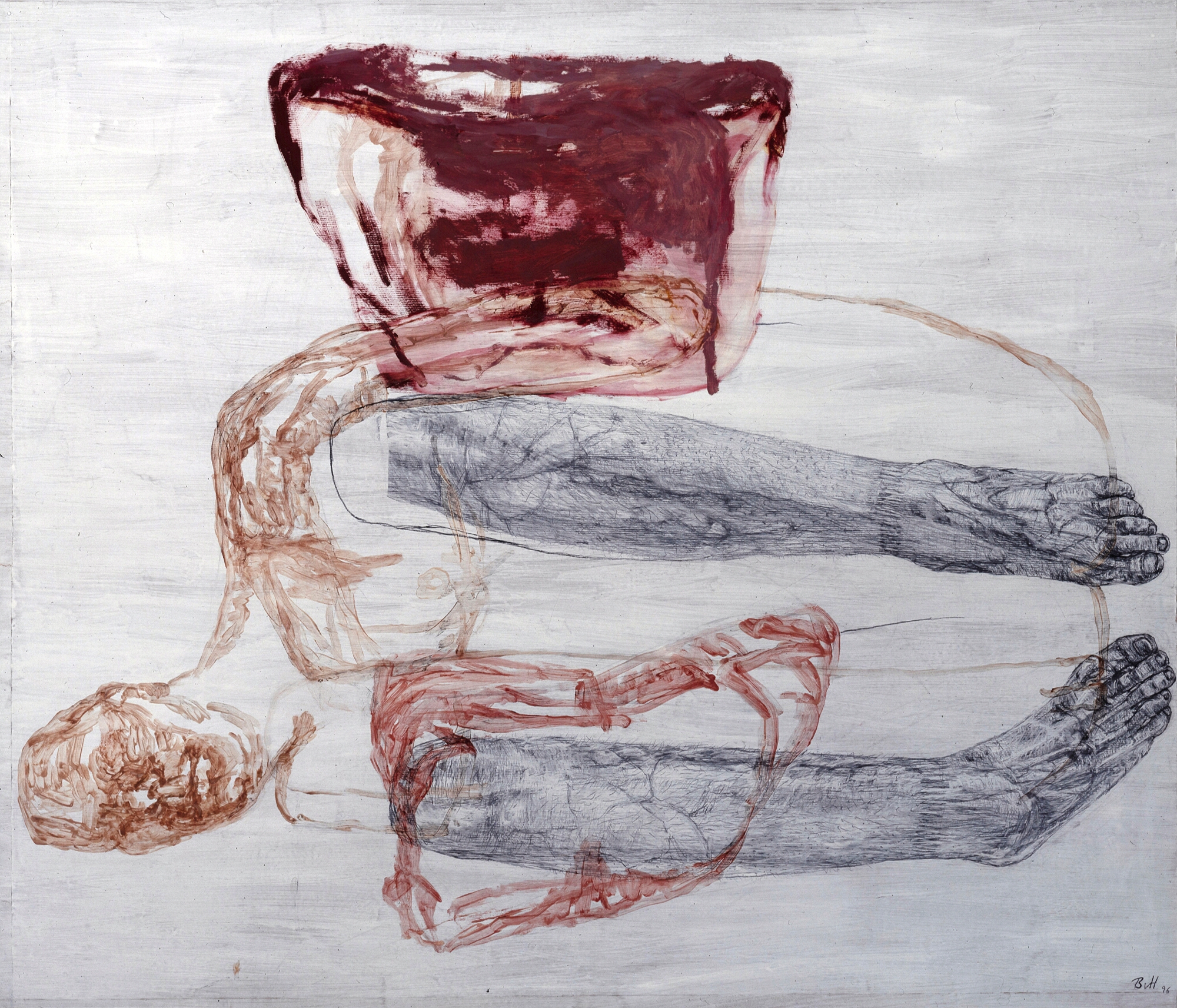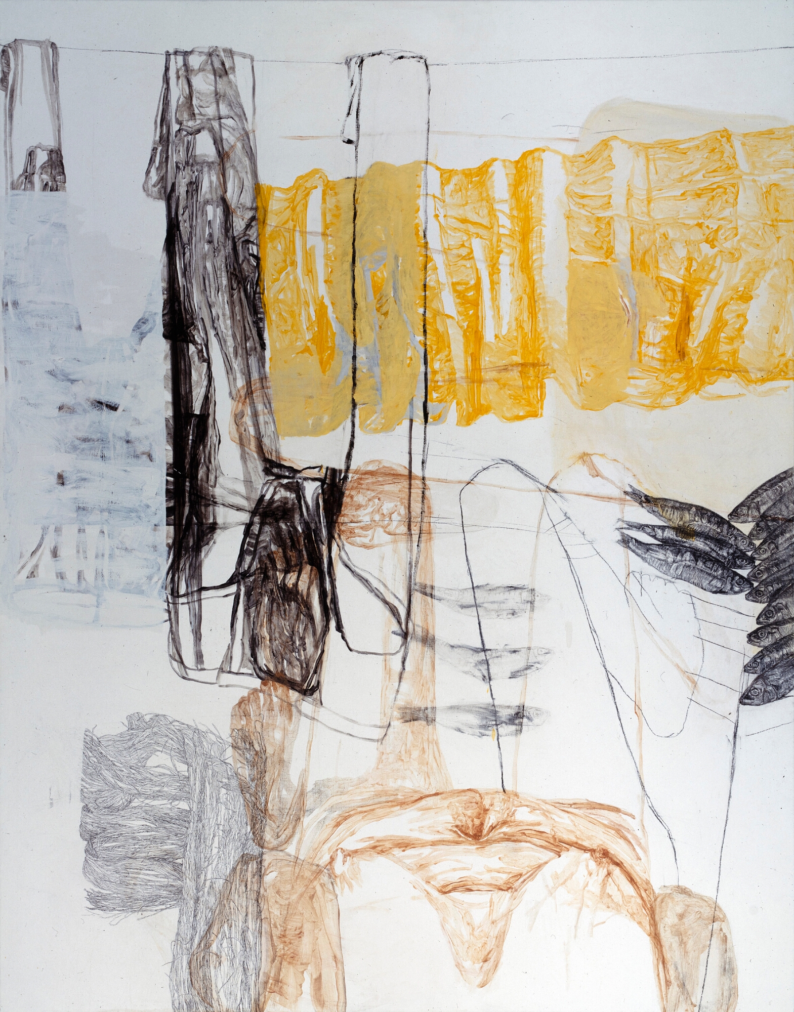 Weihnachtsbild, Eitempera, Öl und Kohle auf Papier, 125 x 105 cm, 1996  Hockende mit Muscheln, Eitempera, Öl und Kohle auf Papier, 124 x 103 cm, 1996  Liegende mit zwei Kissen, Eitempera, Öl und Kohle auf Papier, 106 x 125 cm, 1996  Erwärmte, ausgeschlagen, Eitempera, Öl und Kohle auf Leinwand, 210 x 165 cm, 1996  Einwicklung, Eitempera, Öl und Kohle auf Leinwand, 210 x 165 cm, 1996  Mutterprobe mit Lochung, Eitempera, Öl und Kohle auf Leinwand, 165 x 210 cm, 1996  Kragenträgerin, Eitempera, Öl und Kohle auf Leinwand, 210 x 165 cm, 1996/1997  Stilleben mit Blumentöpfen,, Öl und Kohle auf Leinwand, 210 x 165 cm, 1996  Wäschebild mit Fischgrätenmuster, Eitempera, Öl und Kohle auf Leinwand, 210 x 165 cm, 1996  Daphne, gespiegelt, Öl, Eitempera, Kohle auf Leinwand, 125 x 106 cm, 1996 19971995