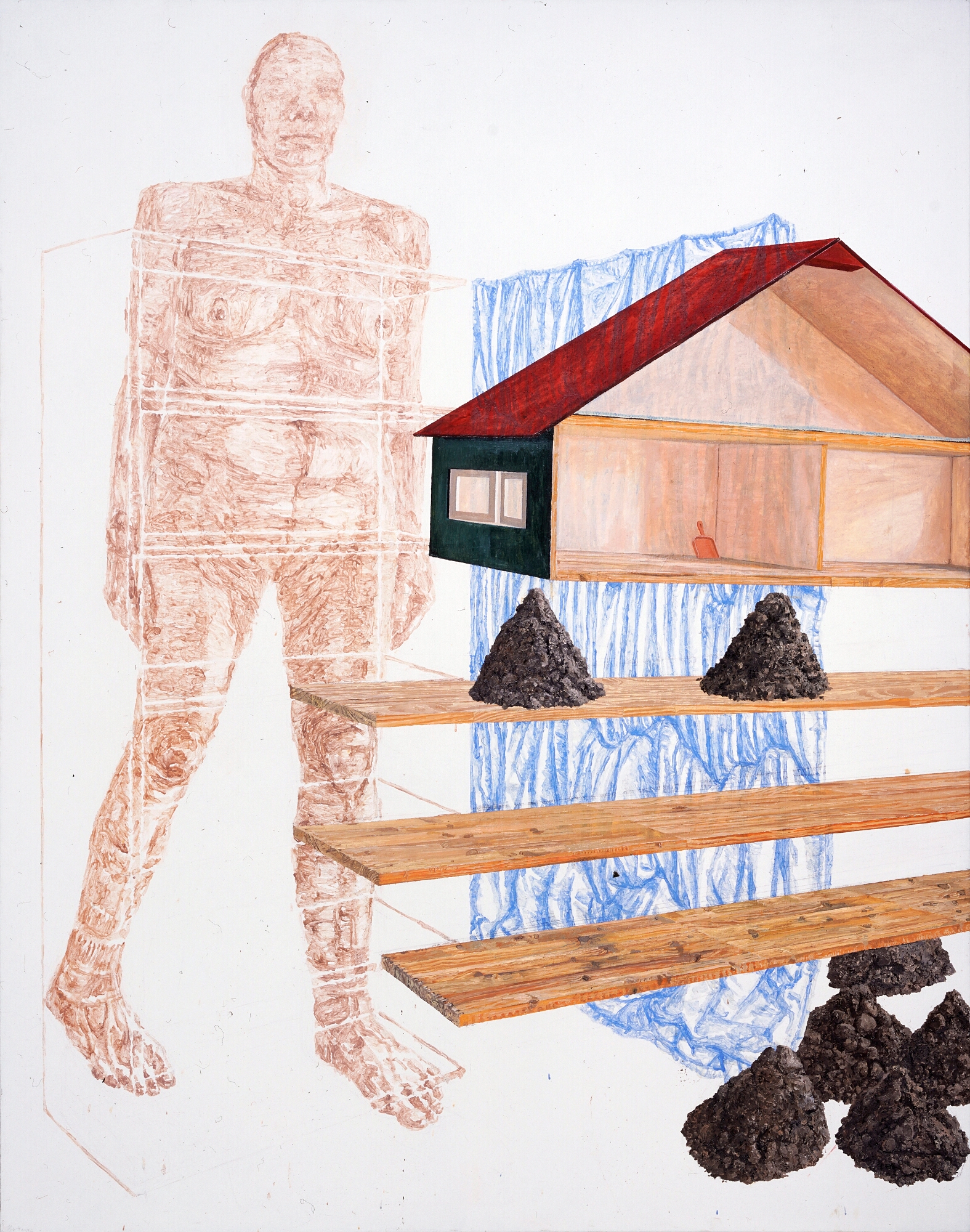 Ordnungswille, Eitemperata, Öl auf Leinwand, 210 x 165 cm, 2001/2002  Baustelle, Eitemperata, Öl auf Leinwand, 210 x 165 cm, 2001  Musterung, Eitemperata, Öl auf Leinwand, 165 x 210 cm, 2001  Grasrutschen, Eitemperata, Öl auf Leinwand, 165 x 210 cm, 2001  Befall, Eitemperata, Öl auf Leinwand, 165 x 210 cm, 2001 20022000